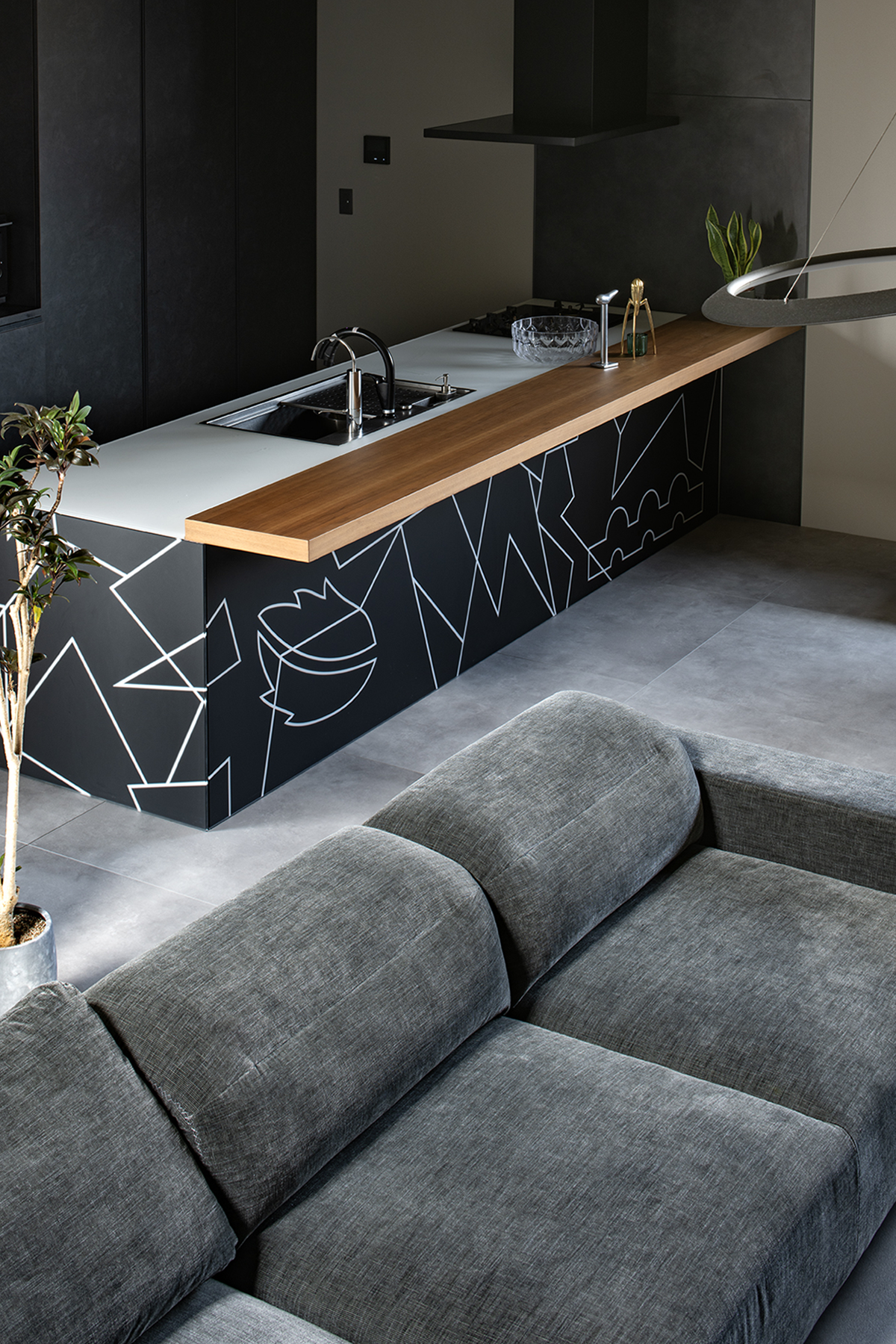 Le ante decorate a mano con Vitrum Arte fanno della cucina un volume intarsiato che, come un quadro, arreda e si presta perfettamente a un open space dove convivono cucina e soggiorno. La palette dei toni neutri, che spazia dal grigio al nero, crea un fondale sobrio e contemporaneo, pronto ad accogliere il segno grafico di Mendini.