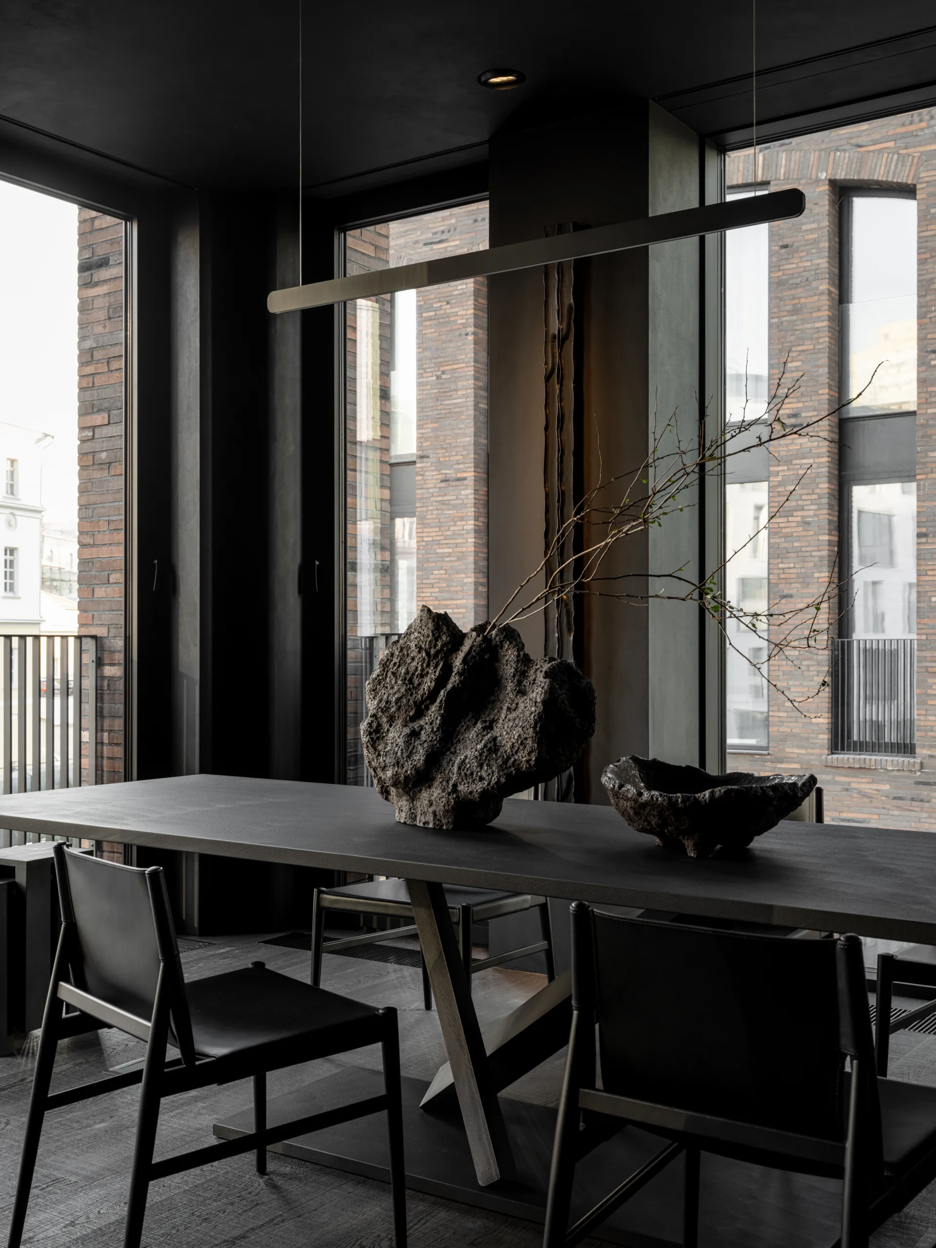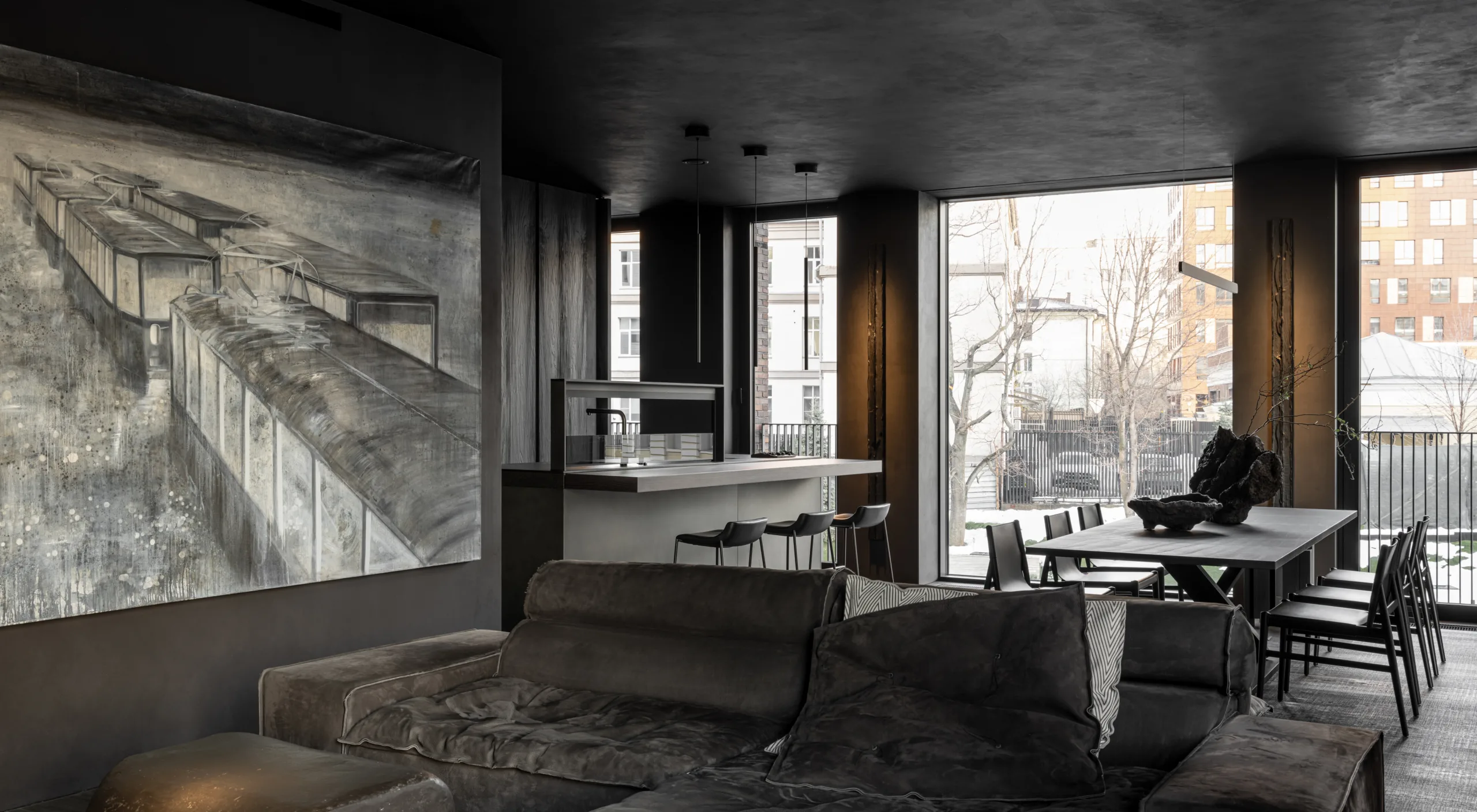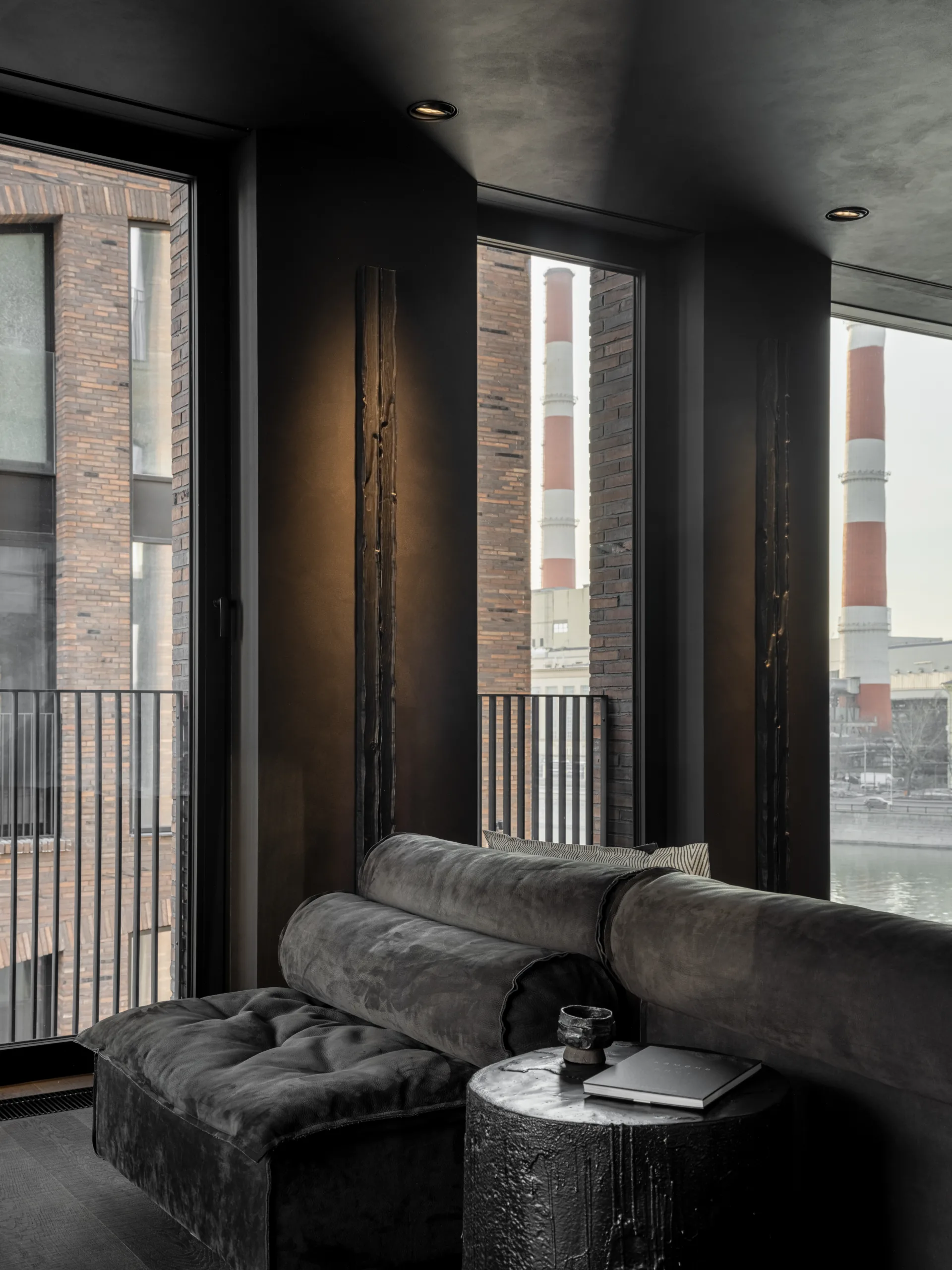 La pianta rettangolare dell'abitazione è scandita da ampie finestre a tutta altezza su due lati, che incorniciano la città e il fiume, lasciando filtrare una luce naturale che penetra in ogni angolo e bilancia la profondità delle tonalità scure con un'inattesa luminosità.
