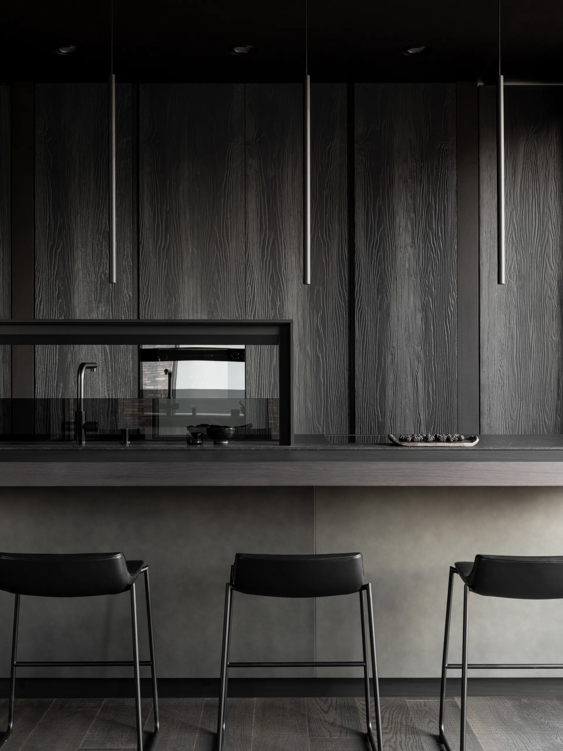 Al cuore dell'abitazione si trova la cucina Genius Loci di Valcucine, protagonista assoluta con il suo coraggioso total black. Acciaio Peltro, granito Nero Assoluto e legno di Olmo Nero si alternano in un dialogo armonioso con il resto degli interni. Il ponte attrezzato e le colonne a muro nei toni del nero definiscono una zona funzionale e scenografica, arricchita da un dettaglio sorprendente: tra le colonne, una porta a scomparsa conduce a una stanza nascosta, aggiungendo un tocco di mistero all'ambiente.